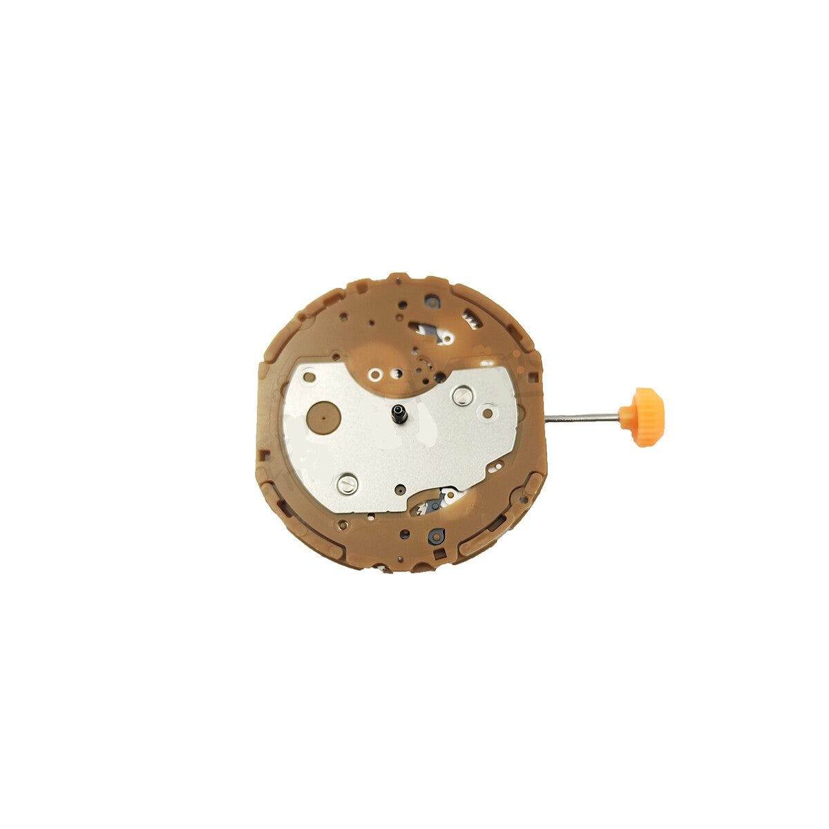The GP50 Miyota Quartz Watch Movement is a 12-ligne, three-hand (hour, minute, sweep second) movement featuring two retrograde indicators: a dual-time retrograde at the 6 o’clock position and a date retrograde at the 12 o’clock position. It measures 27.00 × 25.00 mm with a movement thickness of 3.90 mm and a total height of 5.90 mm. Hand dimensions are 120/70/17/26 for the hour, minute, sweep-second, and day-retrograde hands. This movement contains zero jewels, uses a 371 battery, and is compatible with stem part number 065-992.